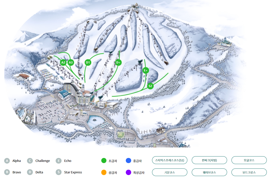 해발 700m에 위치한 알펜시라리조트 스키장은 스키어들의 천국과도 같은 곳입니다. 대관령의 청정 자연에서 만들어지는 깨끗한 눈에 미세 필터 시스템과 염소 등을 추가로 투입하여 안전 관리에 만전을 기하고 있는 제설 시스템으로 운영되고 있습니다.