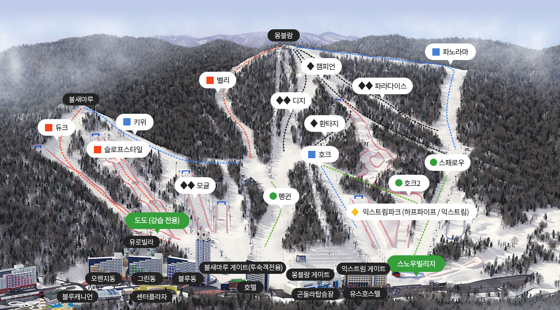 평창 휘닉스 스노우파크는 최고 설질을 자랑하는 평창 올림픽 공식 경기장입니다. 총 18면의 슬로프 중 6면의 프리스타일 스키 & 스노보드 공식 경기장과 2.4km에 이르는 몽블랑 정상 슬로프 파노라마 8기의 리프트 8인승 곤돌라 등이 설치되어 있습니다. 또한 스노보더를 위한 라운드 퀴터, 레일 등이 설치된 익스크림 파크를 운영하고 있습니다.
