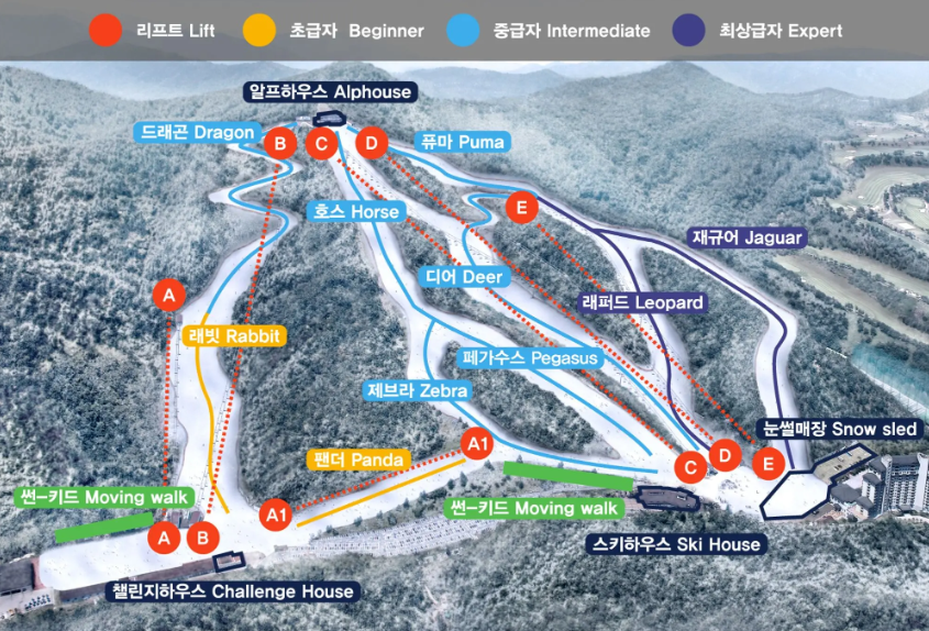 모나용평 스키장은 총 28면의 슬로프와 14기의 리프트 시설을 갖추고 있으며, 올해는 중상급 슬로프인 골드환타스틱도 오픈했다고 합니다.