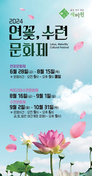 | 연꽃문화제 | 2024. 6. 28.(금) ~ 8. 15.(목) | 매일 09:00 ~ 21:00 |