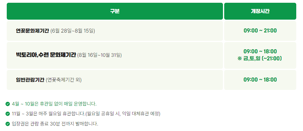 개장시간은 09시부터 18시까지 운영되나 연꽃문화제 기간과 빅토리아. 수련문화제기안의 금. 토. 일요일에는 21시까지 운영합니다.