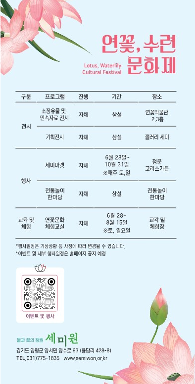 연꽃문화체험교실은 6월 28일부터 8월 15일까지 매주 토. 일요일에 교각 및 체험장에서 진행되며, 세미마켓은 6월 28일부터 10월 31일까지 매주 토. 일요일에 정문 코러스가든에서 진행됩니다.