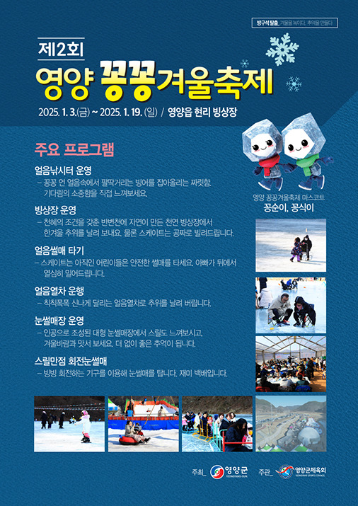 영양군영양읍 현리 반변천에서 2025년 1월 3일부터 1월 19일까지 17일간의 일정으로 개최되는 영양꽁꽁겨울축제는 천연빙상장(스케이트장. 얼음썰매장, 얼음열차), 놀이시설(눈썰매장, 회전눈썰매장) 그리고 얼음낚시터(빙어낚시터) 등의 프로그램을 준비되어 있습니다.