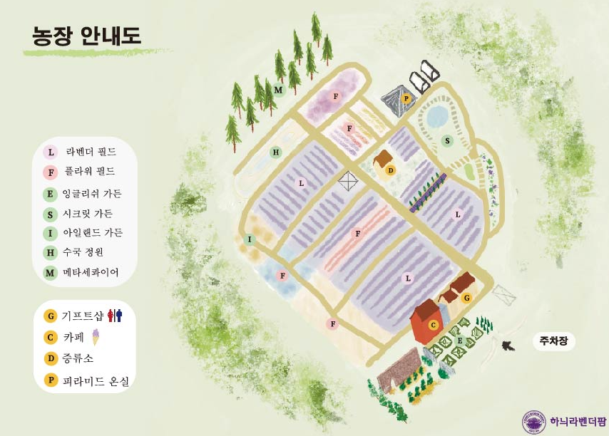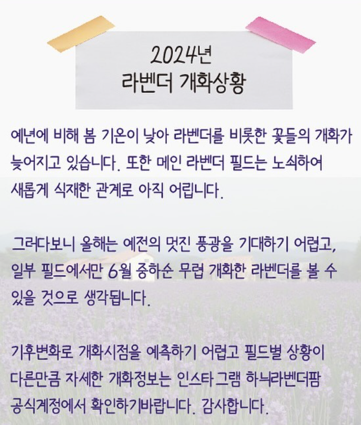 올해 하늬팜 라벤더는 날씨 관계로 개화도 늦어지고 메인 라벤더 필드는 노쇠하여 새로 식재한 라벤더는 아직 어려 예년의 풍광은 못 볼 수도 있다고 합니다.