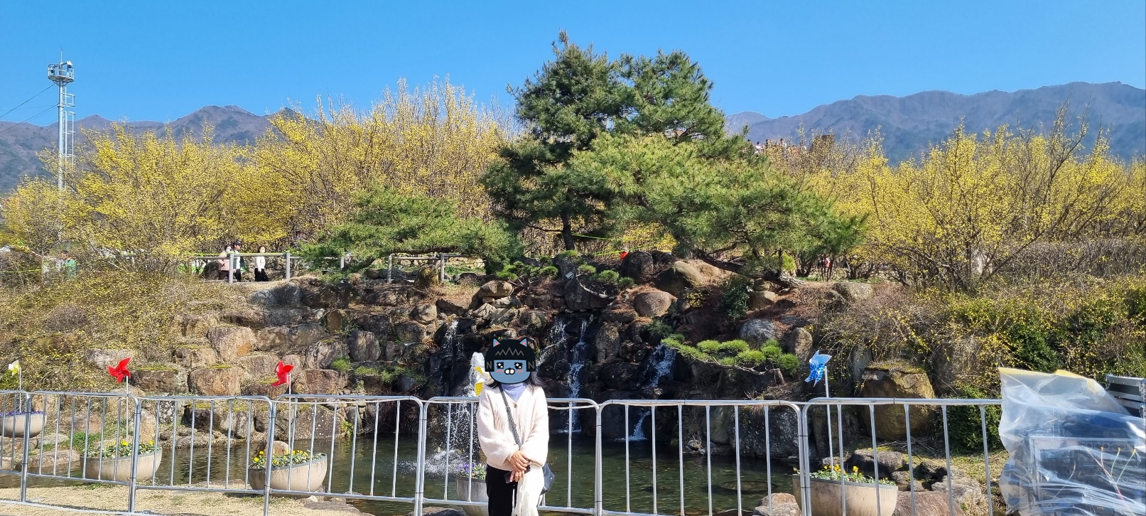 노란 산유와 인공 폭포의 물줄기가 따스한 봄날에 시원한 여름풍경을 더해줍니다.