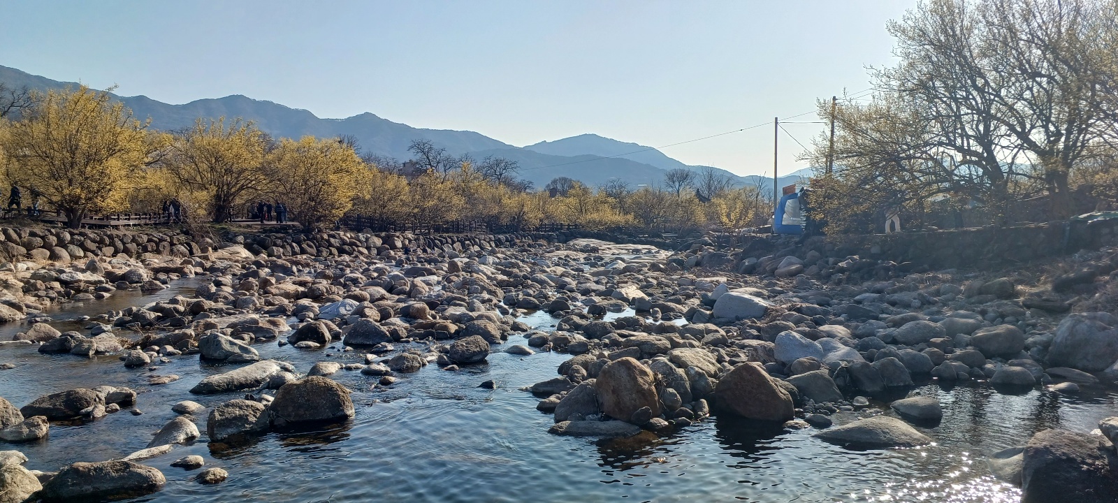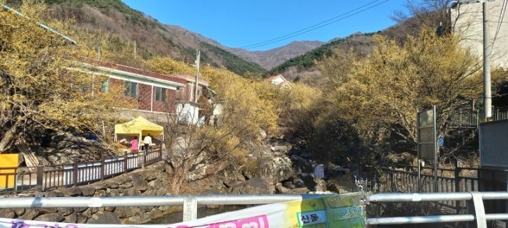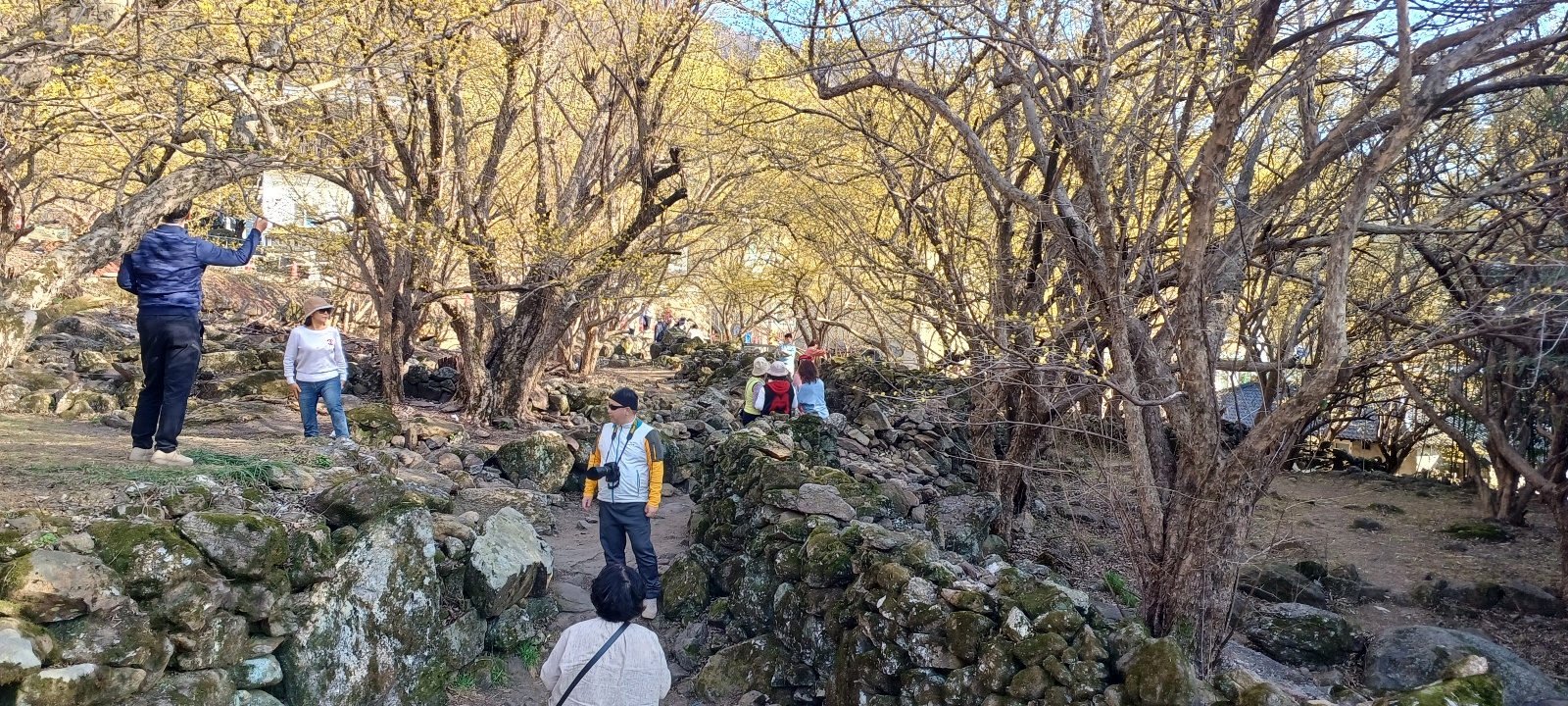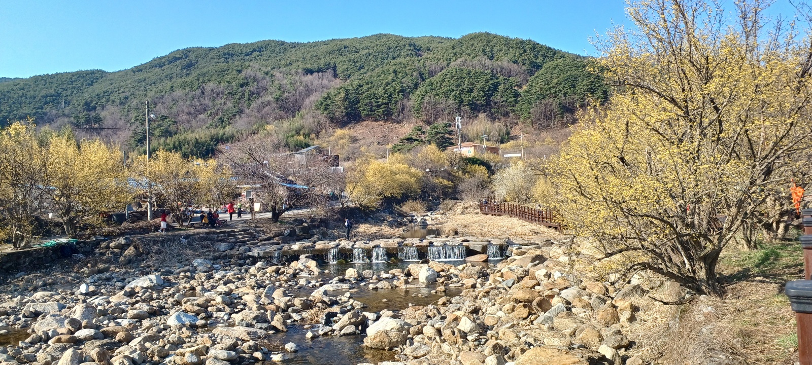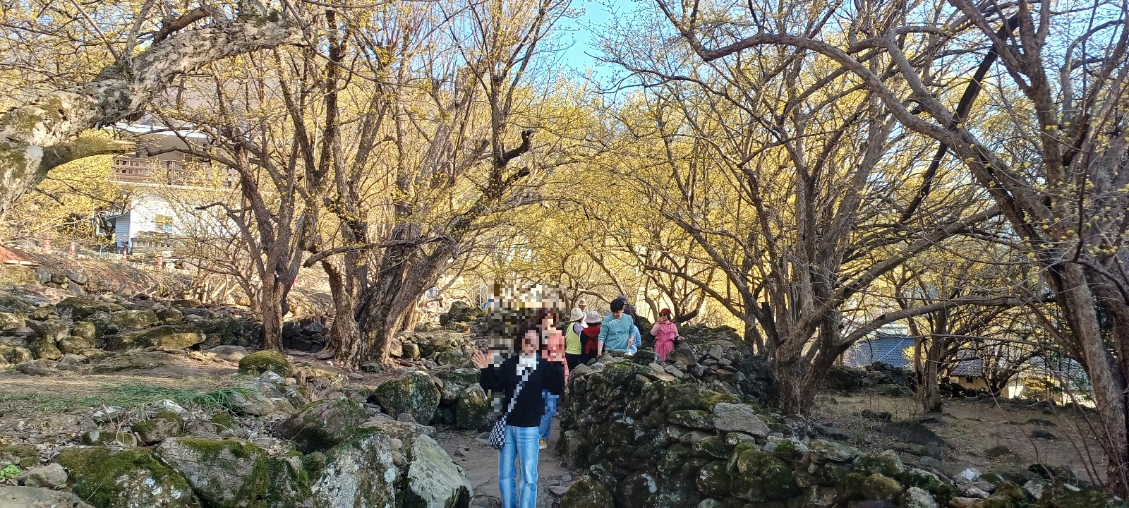 상위마을 입구에 있는 계곡 가득 산수유가 피었습니다. 계곡을 따라 올라가면 수령이 아주 오래된 산수유나무들을 만나고 돌담길도 걸을 수 있지만 체력이 바닥난 저희는 작년에 걸었던 길이라 이번에는 생략했습니다.