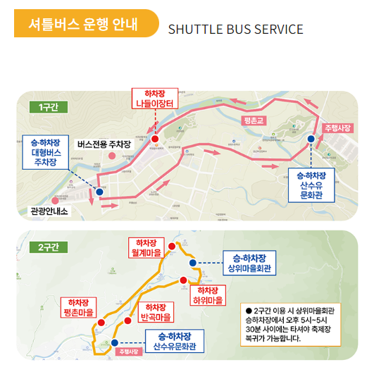 3월 16일(토)과 17일(일) 방문하신다면 지리산온천랜드 근처 주차장에 주차 후 셔틀버스를 이용하여 축제장으로 갈 수 있습니다.
