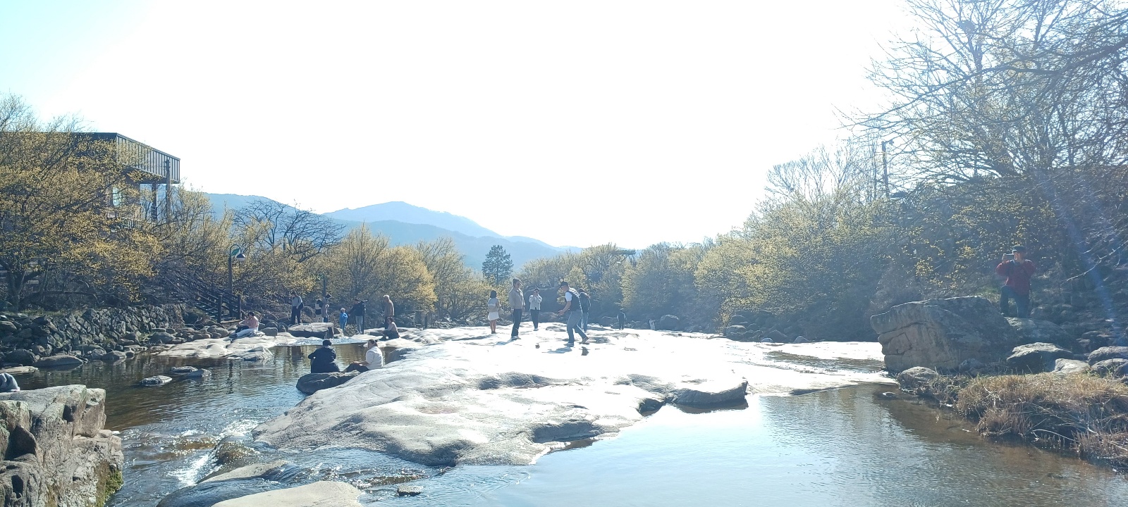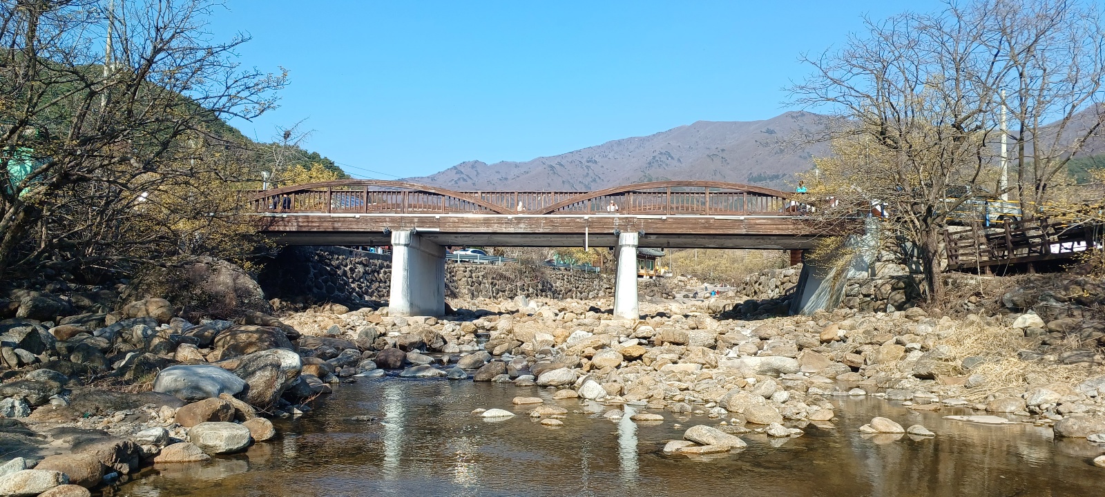 마을 앞으로 흐르는 서시천의 다리 대음교의 위쪽과 아래쪽에 넓고 평평한 바위가 있어서 사진 찍기 좋아요.