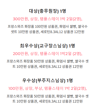 수상은 프로 부문 대상 300만원, 휴대폰 부문 대상 100만원 등 총 880만원의 상금이 전달됩니다. 이 밖에 각종 상품권, 50인치 TV, 템플스테이 1박 2일 등의 상품도 함께 증정됩니다.