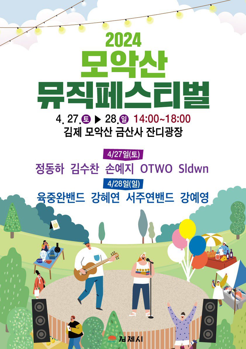봄꽃 흩날리는 싱그러운 봄날에 봄 선율과 다채로운 음악으로 풍성한 음악축제가 김제에서 개최됩니다. 모악산의 생동하는 봄 풍경 속에서 출연가수들의 봄기운 가득한 노래뿐만 아니라 다양한 부대행사까지 함께하는 김제 2024 모악산 뮤직페스티벌 속으로 함께 떠나봐요.