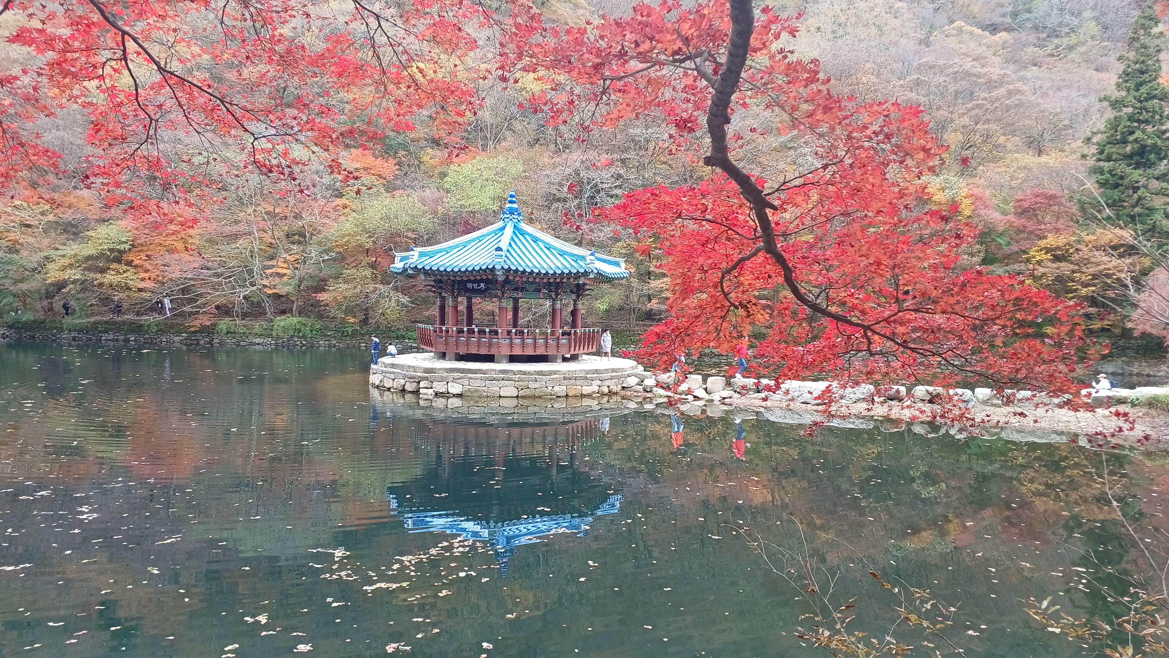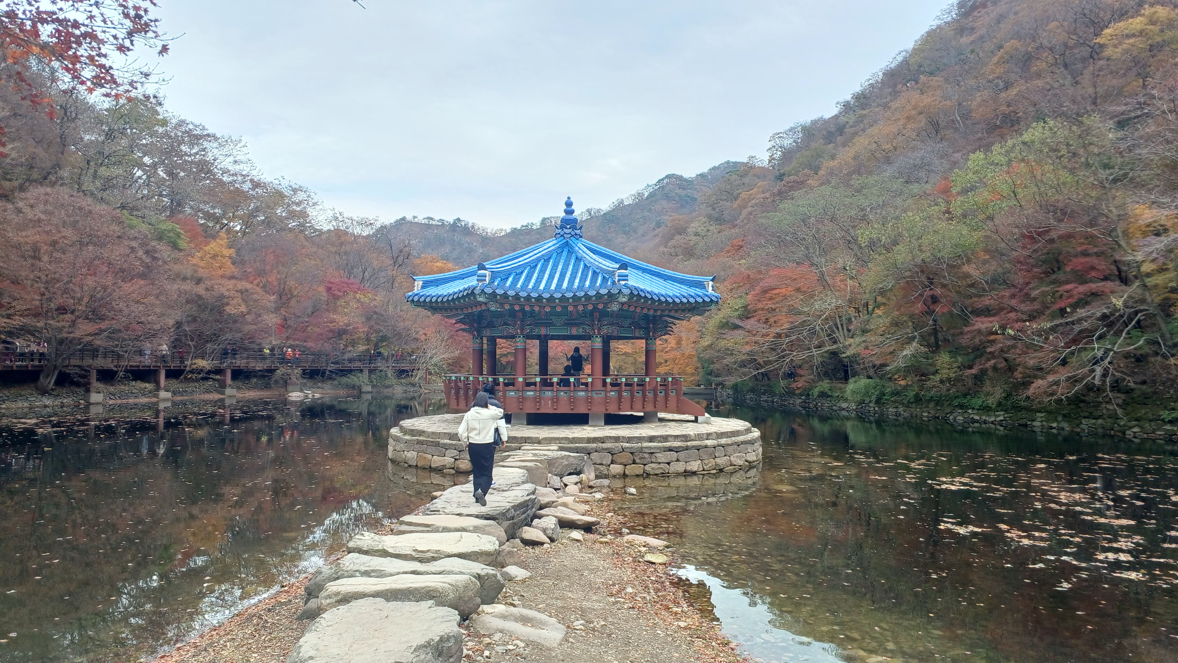 단풍길을 따라 걷다 보면 내장산의 명소 중 하나인 우화정에 도착합니다. 붉은 단풍 속에 자리한 우화정을 기대했지만, 생각보다 단풍이 풍성하지 않아 약간 아쉬웠어요. 우화정은 연못과 어우러진 풍경이 아름다운 곳이니, 단풍이 절정일 때 방문하면 더욱 멋진 모습을 볼 수 있을 겁니다.