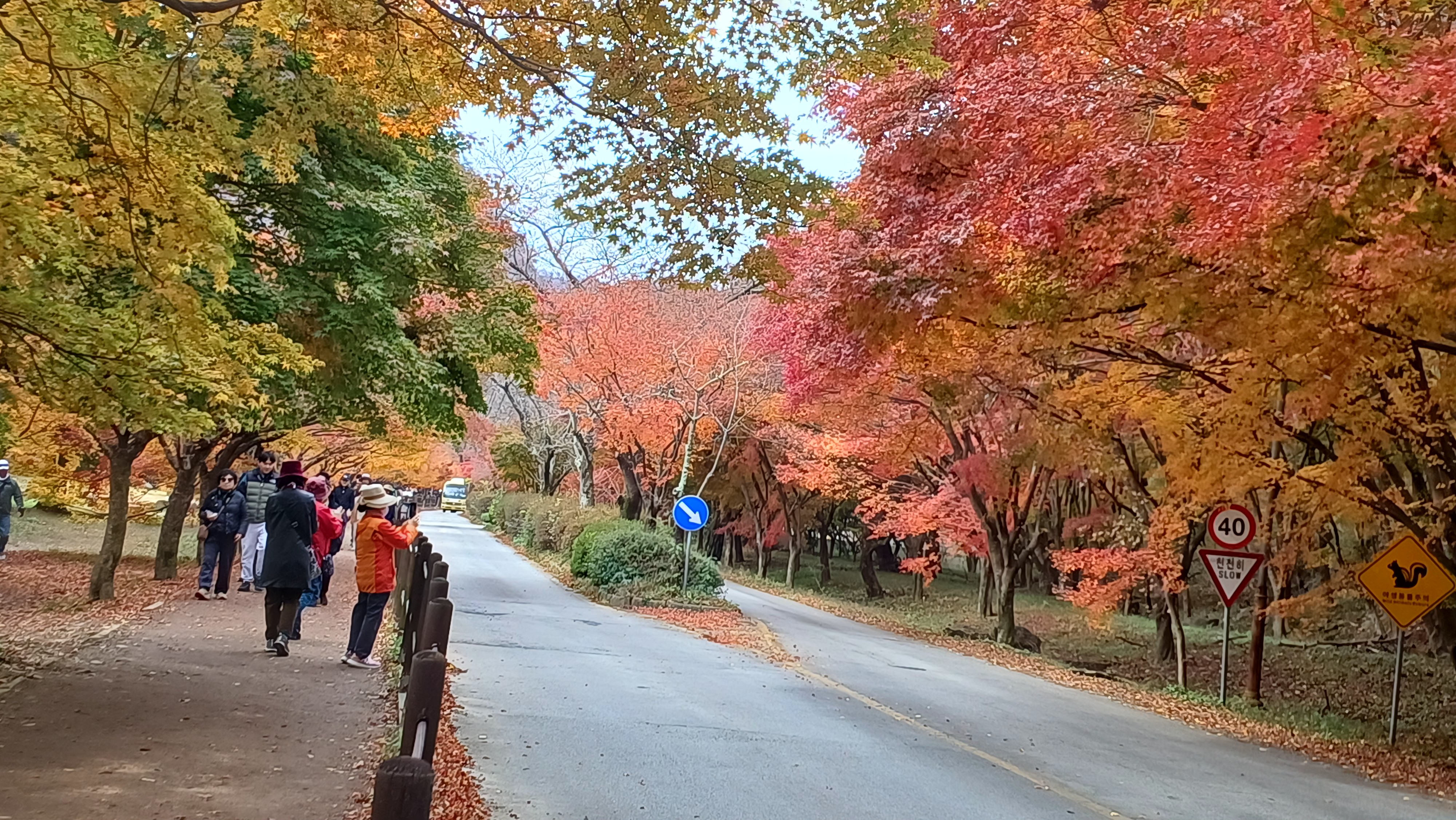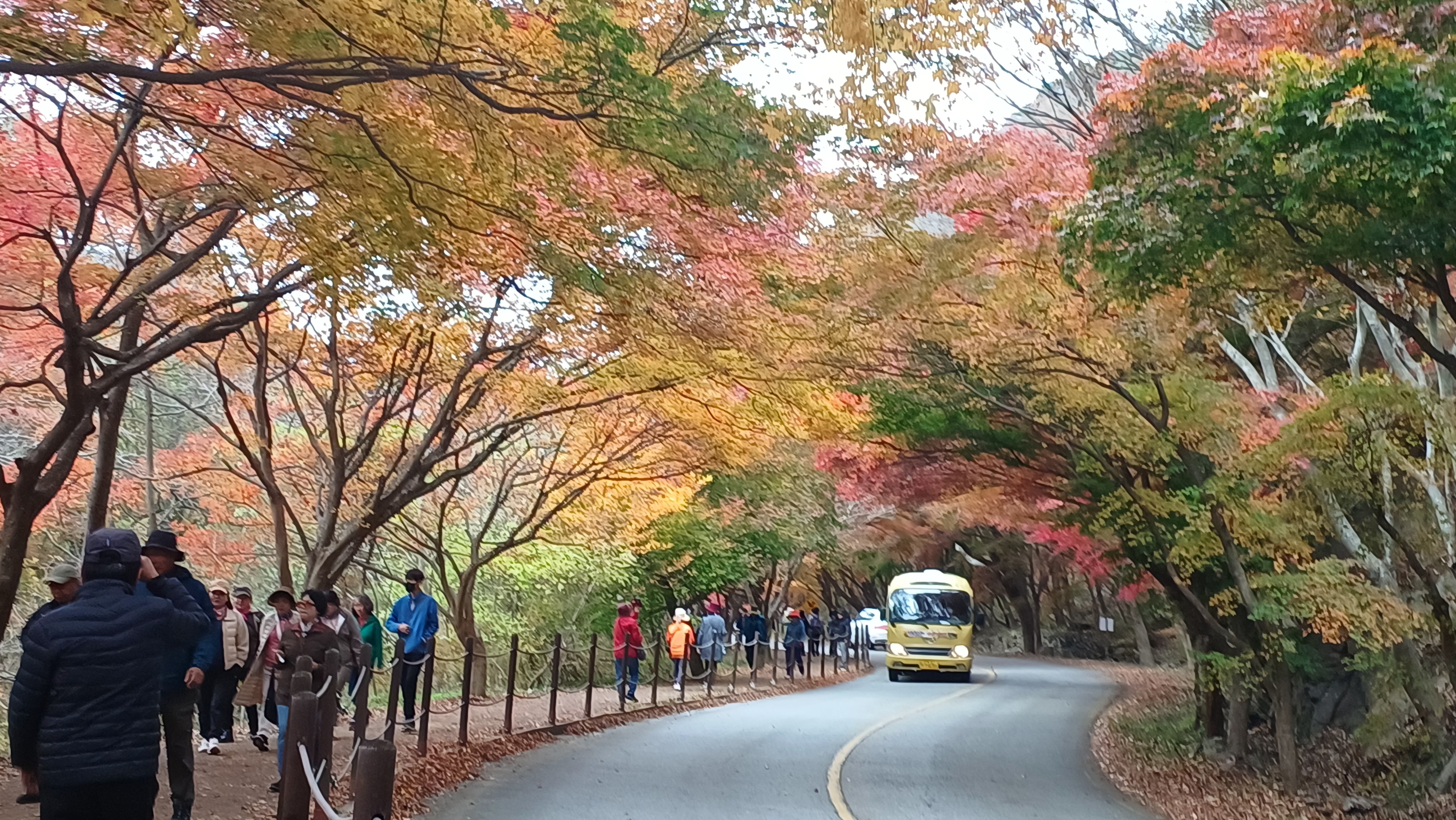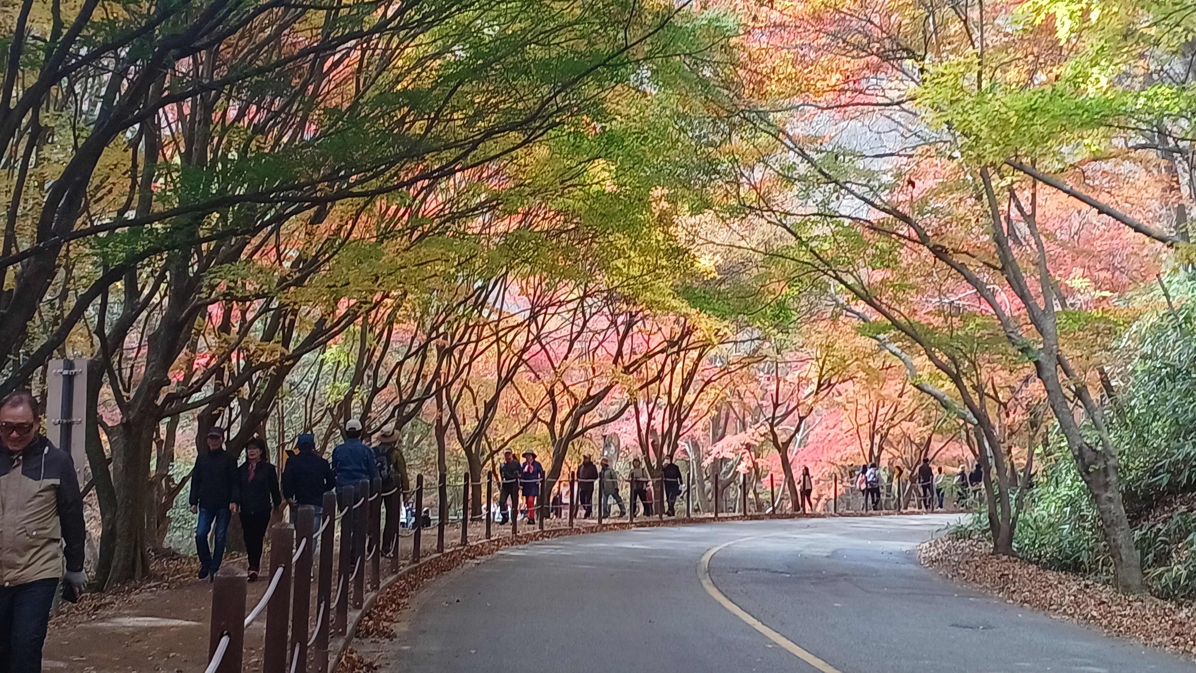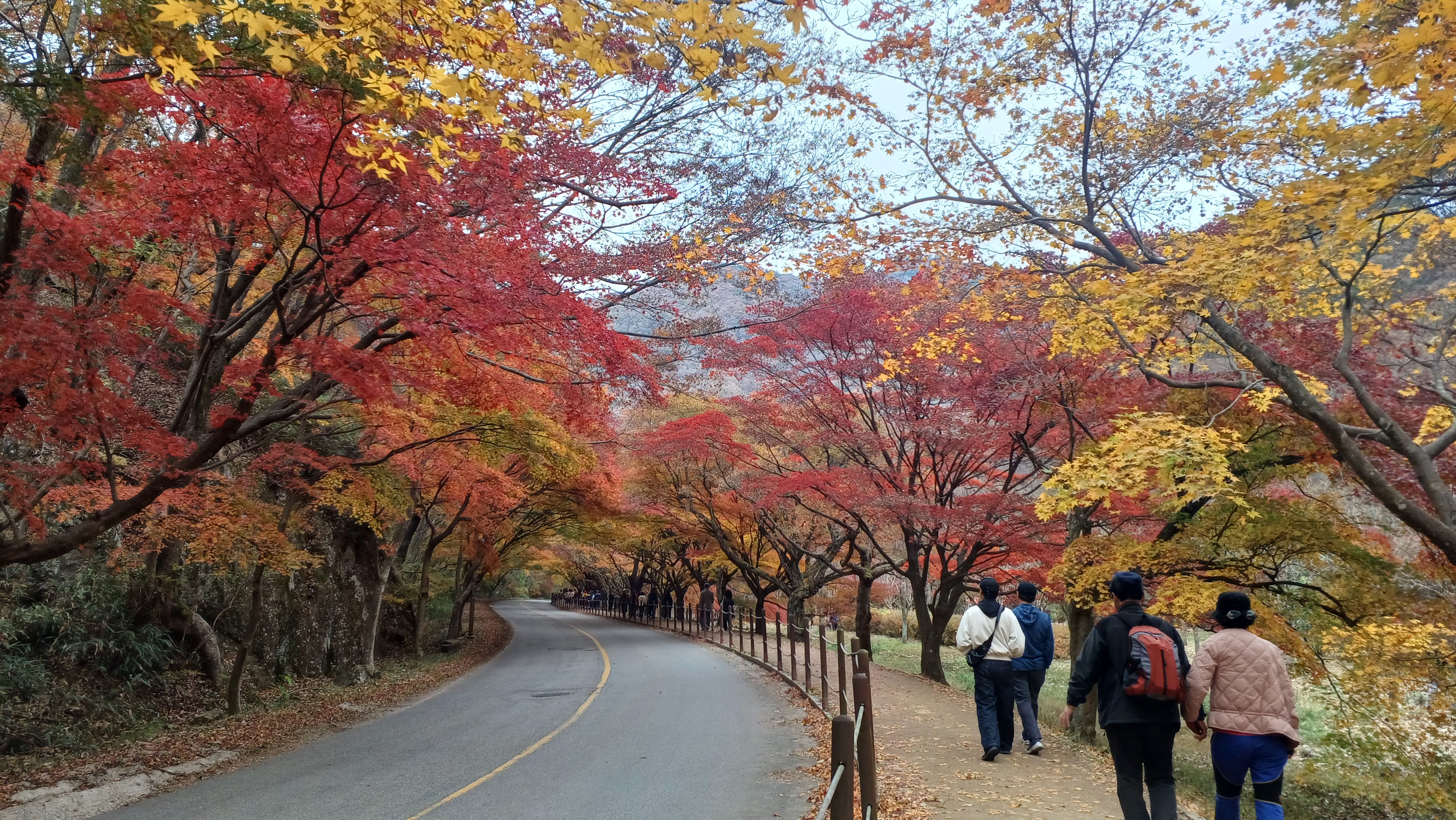 내장산 초입부터 붉게 물든 단풍이 저를 반겨주었어요. 도로는 차량만 다닐 수 있도록 통제되어 있었고, 사람들은 도로 옆 인도로 안전하게 다닐 수 있었습니다.