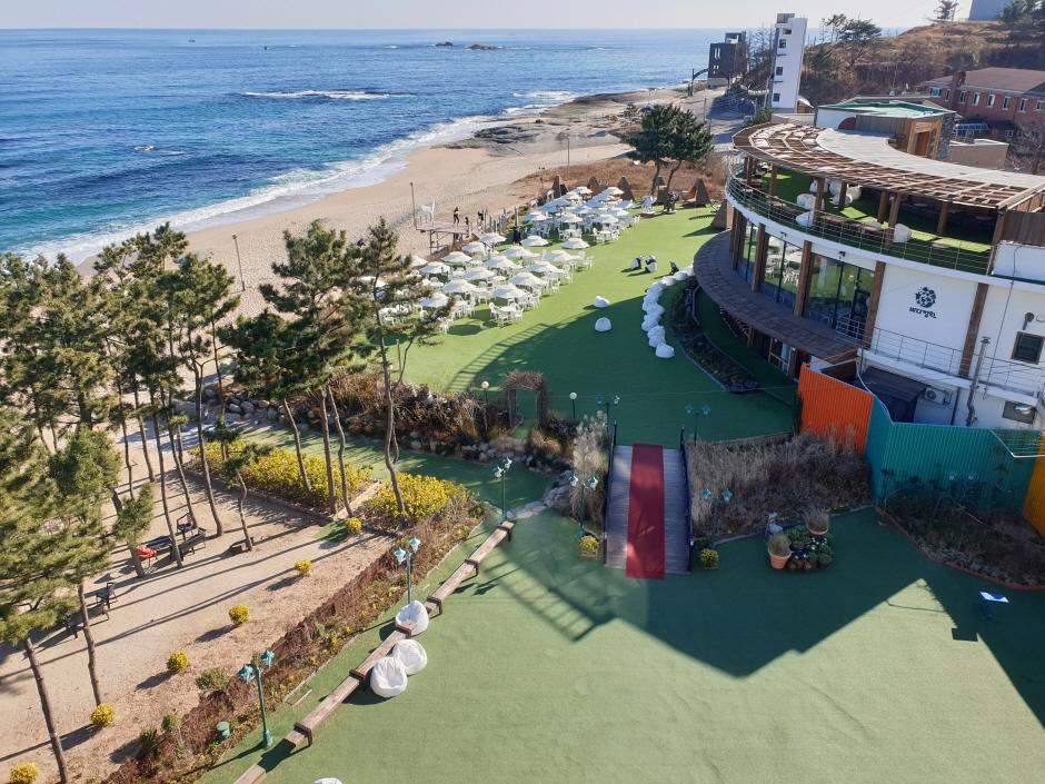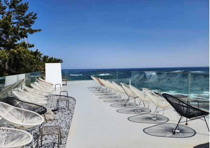 카페의 정원은 꽃이 가득하며 백사장과 바로 연결되어 있어 탁 트인 바다를 한눈에 담을 수 있고 또한 5층 루프탑은 넓은 바다와 설악산 울산바위가 한눈에 보여 카페 곳곳이 인생샷을 남길 수 있습니다.
