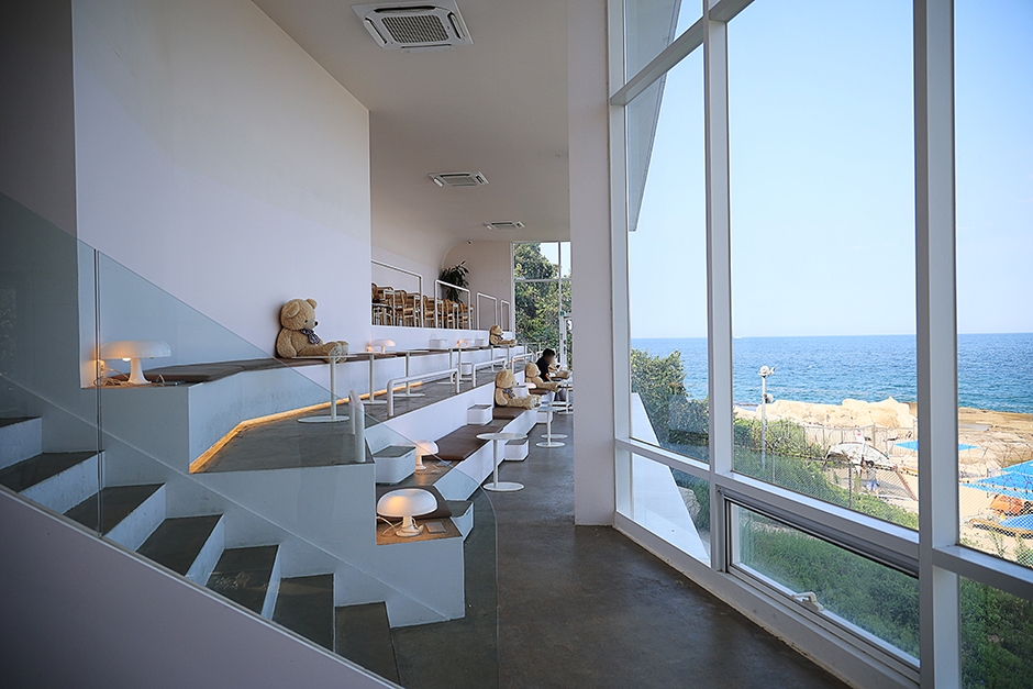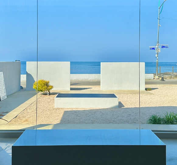 태시트는 건 물의 하얀 벽과 커다란 통창으로 보이는 푸른 바다가 마치 해변의 작은 미술관처럼 느껴지는 오션뷰 카입니다.