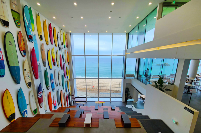 송지호 근방 해변에 위치한 카페로 건물은 3층 규모의 에어프레임은 실내에는 서프보드로 장식된 계단식 좌석이 이목을 끄는 곳입니다. 커피 한 잔 마시며 실내 통유리로 풍경 감상도 할 수 있고 루프탑이 있어 해변 물멍하기에도 좋습니다.