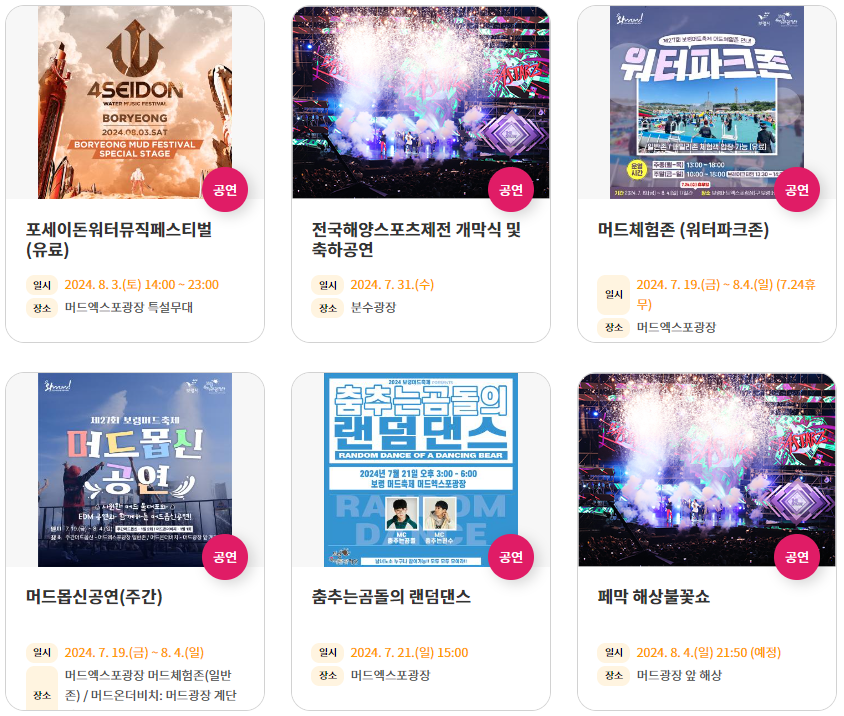 포세이돈워터뮤직페스티벌(유료), 전국해양스포츠제전 개막식 및 축하공연, 폐막 해상불꽃쇼 등 다양한 공연이 축제기간 내내 진행됩니다. 위 사진을 클릭 후 공연에 대한 자세한 내용 확인 가능합니다.