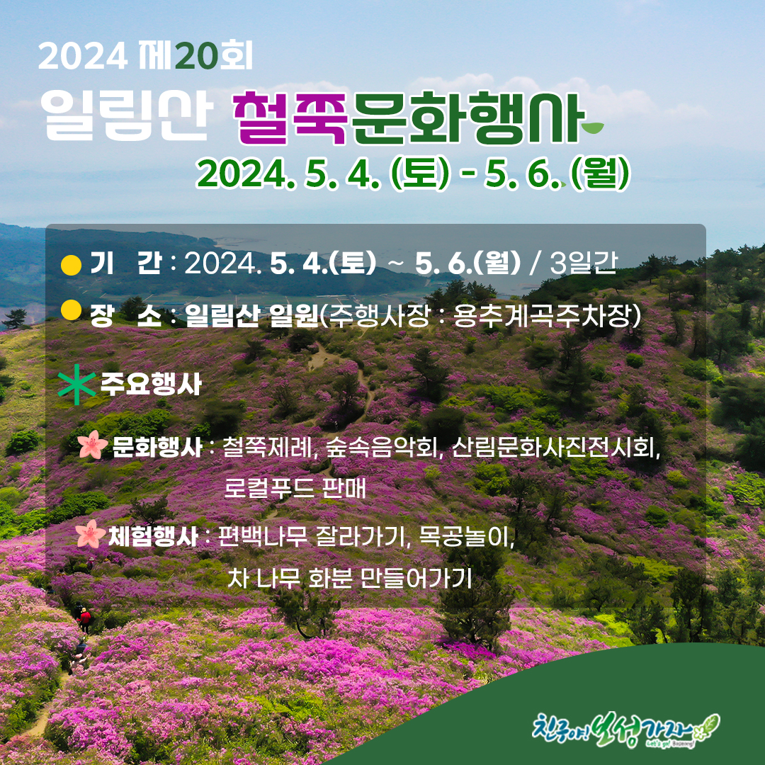 산이 깊어 숲 속에 들어가면 해를 볼 수 없는 산이라 일림산으로 이름 붙여진 전국 최대의 철쭉군란지인 보성 일림산에서 철쭉축제인 '제20회 일림산 철쭉문화행사'가 개최됩니다. 연분홍빛 철쭉과 드넓은 차밭이 푸른 바다를 배경으로 어우러져 만들어내는 아름다운 경관을 누려 보시기 바랍니다.