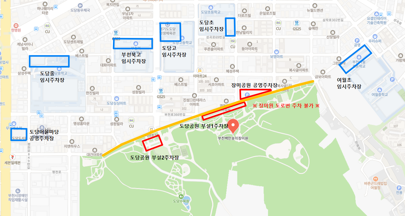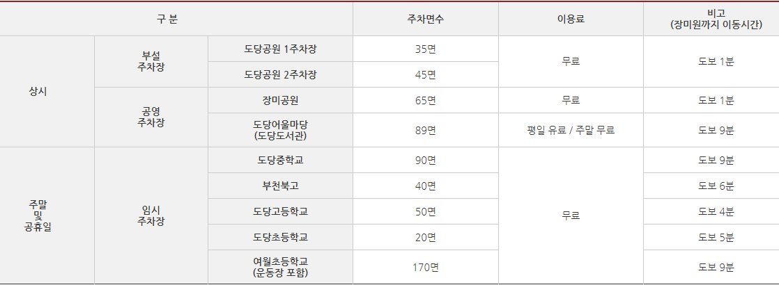 도당중학교 외 학교 주차장은 주말과 공휴일에만 이용할 수 있으며, 장미원 옆 도로변에는 주차 불가지역이니 지정된 주차장에 주차하시기 바랍니다.