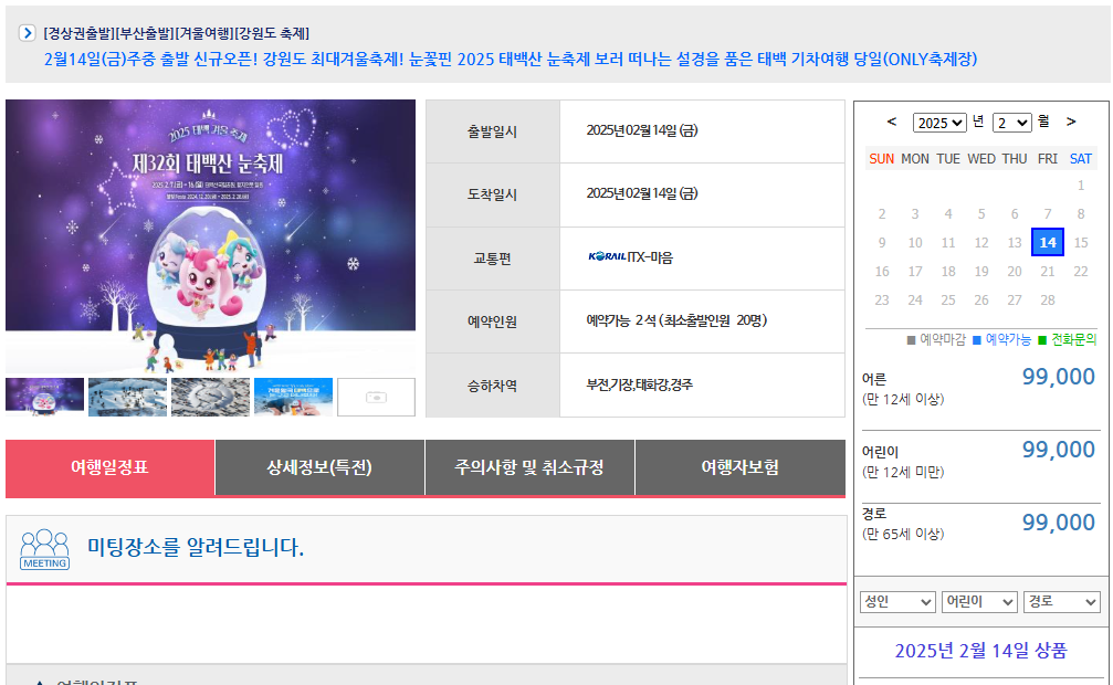 2월 14일(금) 평일에 출발하는 상품이 신규 오픈되었습니다. '강원도 최대겨울축제! 눈꽃핀 2025 태백산 눈축제 보러 떠나는 설경을 품은 태백 기차여행 당일(ONLY축제장)' 상품은 주말이 아닌 주중에 출발하는 상품으로 다른 행선지 없이 태백눈꽃축제장만 방문하여 여유롭게 축제를 즐길 수 있겠습니다.