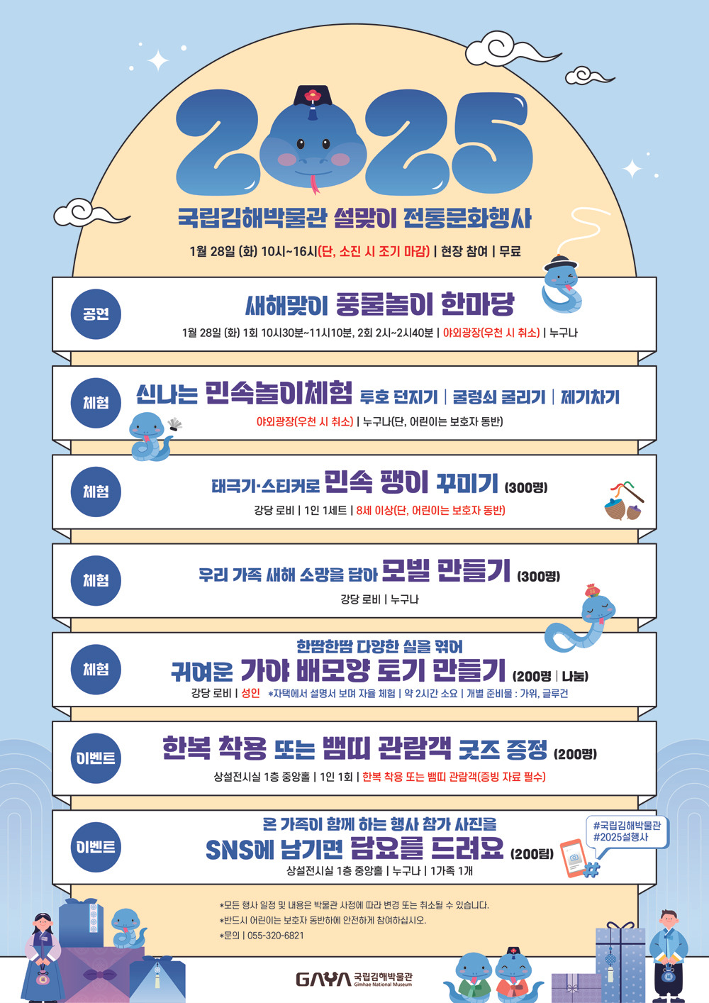 국립김해박물관은 설을 맞아 공연, 체험 등 다양한 설맞이 1월 28일(화) 10시부터 16시까지 전통문화행사를 운영합니다. 모든 행사는 무료로 진행됩니다.