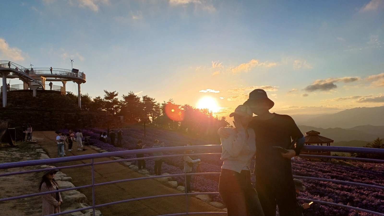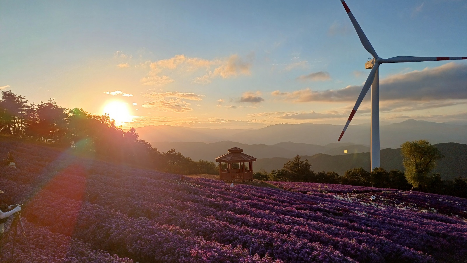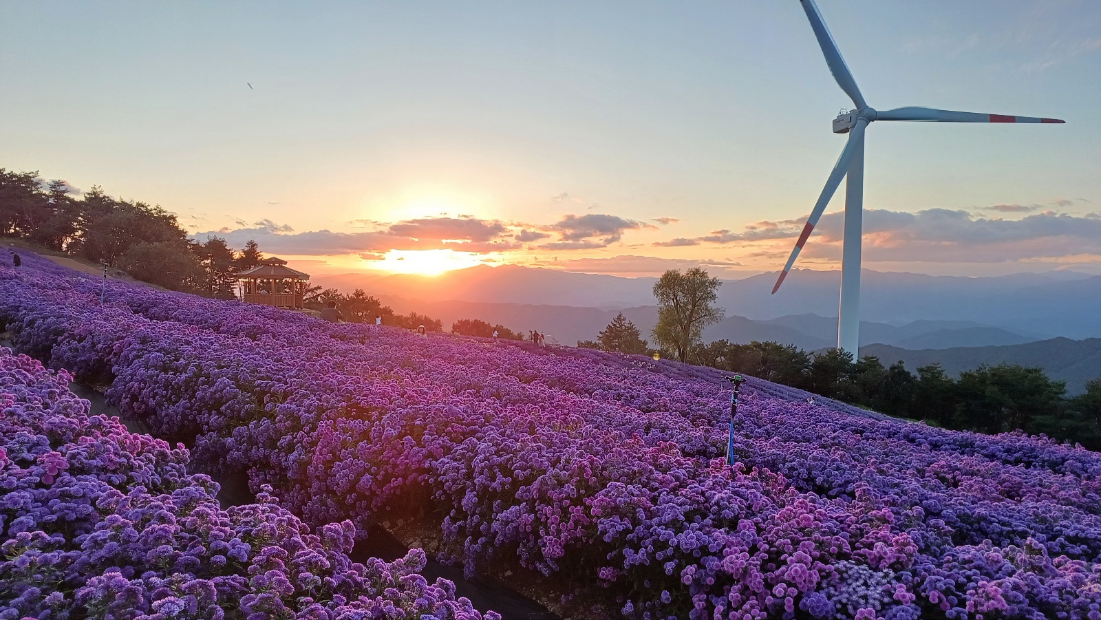 아스타국화의 성지 거창 감악산 별바람언덕이 보랏빛 세상으로 물들었습니다. 더운 여름 날씨를 이겨내고 풍성하게 피어난 아스타국화로 가득한 거창 감악산 별바람언덕에 선선한 가을바람이 더해져 천상의 화원을 거닐기 더없이 좋은 계절입니다. 가을꽃, 가을바람, 가을햇살 만끽할 수 있는 거창 감악산 별바람언덕으로 가을감성 여행 떠나보세요.