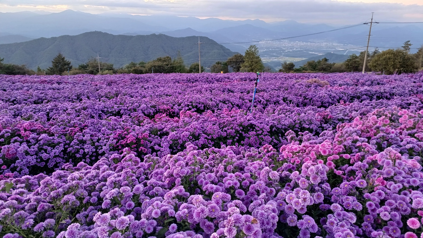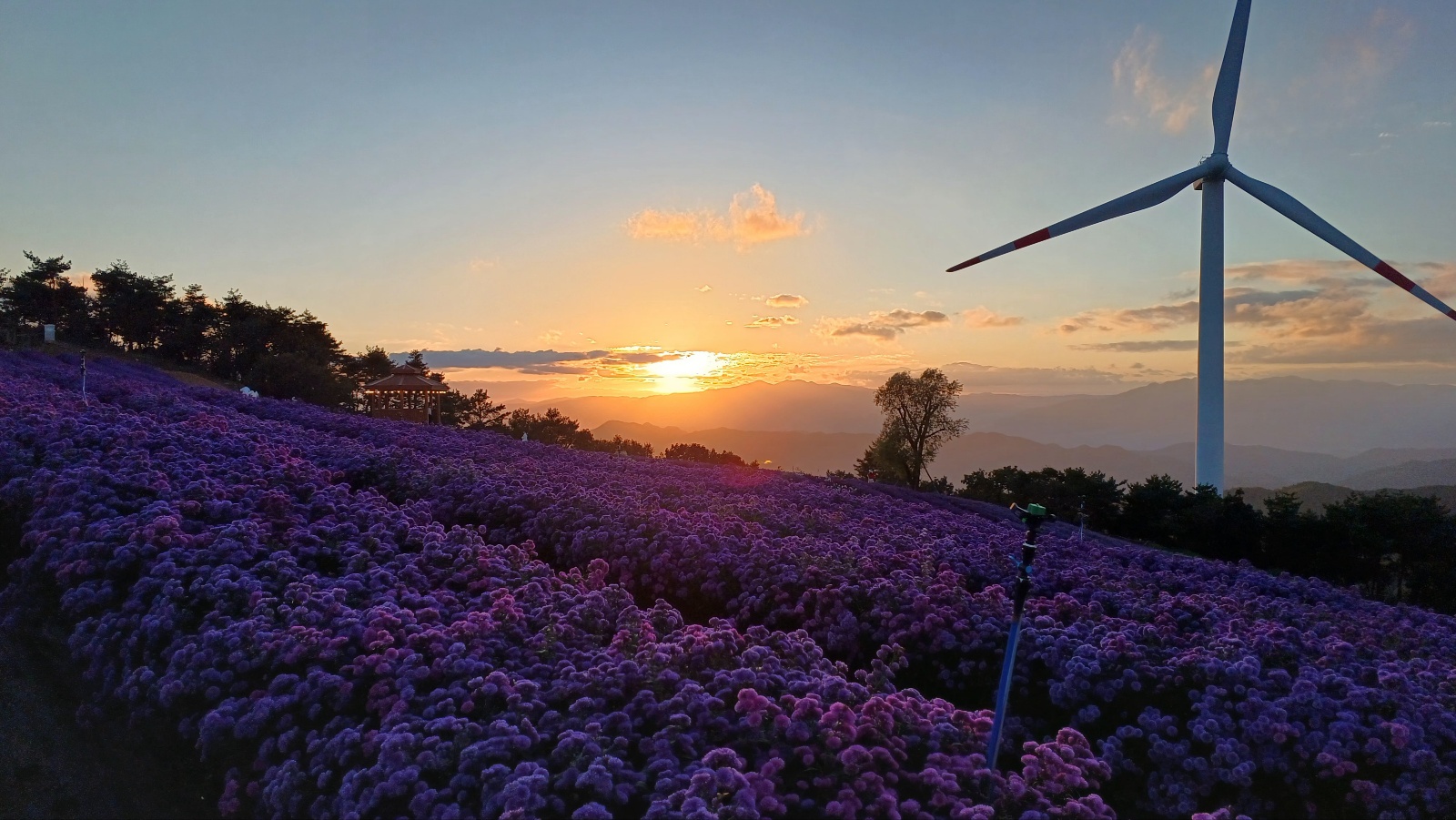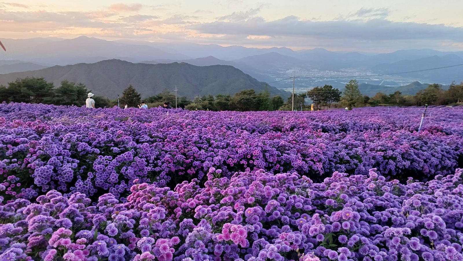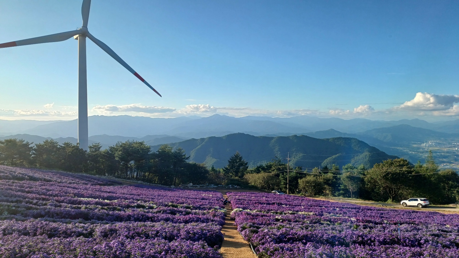 아스타국화의 성지 거창 감악산 별바람언덕이 보랏빛 세상으로 물들었습니다. 더운 여름 날씨를 이겨내고 풍성하게 피어난 아스타국화로 가득한 거창 감악산 별바람언덕에 선선한 가을바람이 더해져 천상의 화원을 거닐기 더없이 좋은 계절입니다. 가을꽃, 가을바람, 가을햇살 만끽할 수 있는 거창 감악산 별바람언덕으로 가을감성 여행 떠나보세요.