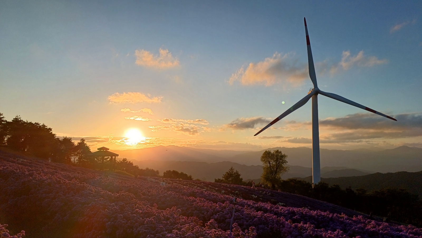 커다라 풍력발전기와 저 멀리 산 위에 걸린 하얀 구름 그리고 보라색 아스타국화....