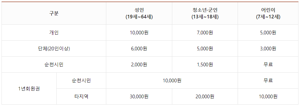 순천시민 및 20인 이상 단체는 할인요금인 적용됩니다.