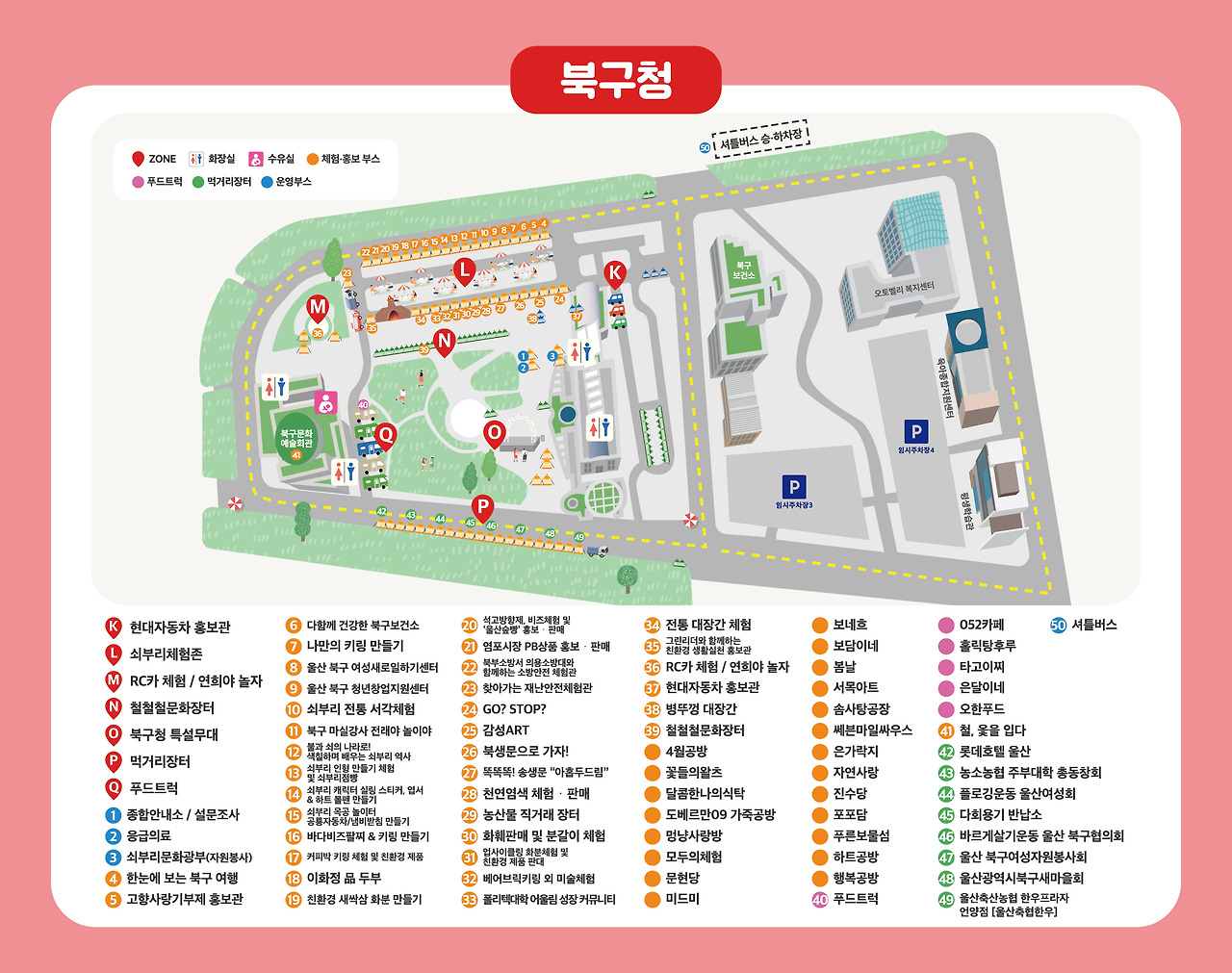 울산쇠부리축제 기간 동안 업사이클링 체험, 두더지 잡기 및 DDR체험, 친환경 굿즈 만들기 등 다양한 체험행사도 진행됩니다. 또한 북구문화예술회관 야외공연장에서는 RC카 체험 및 경연대회가 열려 스릴 넘치는 재미를 즐길 수 있습니다.