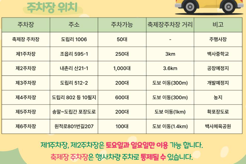 *축제장 주차장은 행사관계차량으로 주차가 통제될 수 있습니다.