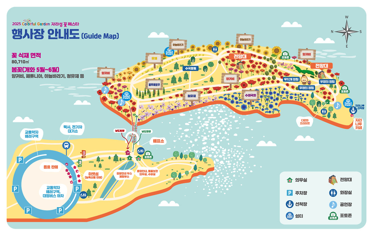 자라섬은 대중교통보다는 자차 이용이 편리합니다. 내비게이션에 '자라섬'을 검색하면 축제장으로 안내되며, 주차장은 섬입구와 내부에 총 3곳이 마련되어 있습니다.