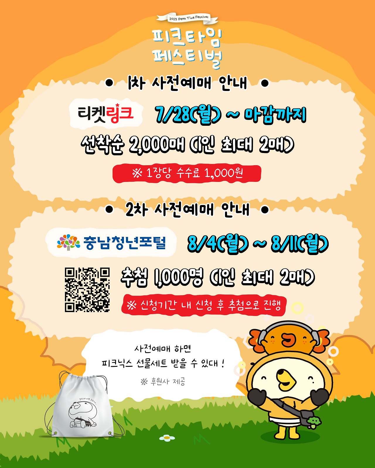 2025 피크타임 페스티벌은 전 좌석 피크닉석 형태로 누구나 잔디밭에 앉아 자유롭게 공연을 관람할 수 있습니다. 사전 예매는 7월 28일부터 티켓링크를 통해, 8월 4일부터는 충남청년포털을 통해 순차적으로 진행됩니다. 사전 예매표를 소지한 분들에게는 입장 우선권이 주어지므로, 원활한 입장을 위해 사전 예매를 권장합니다.