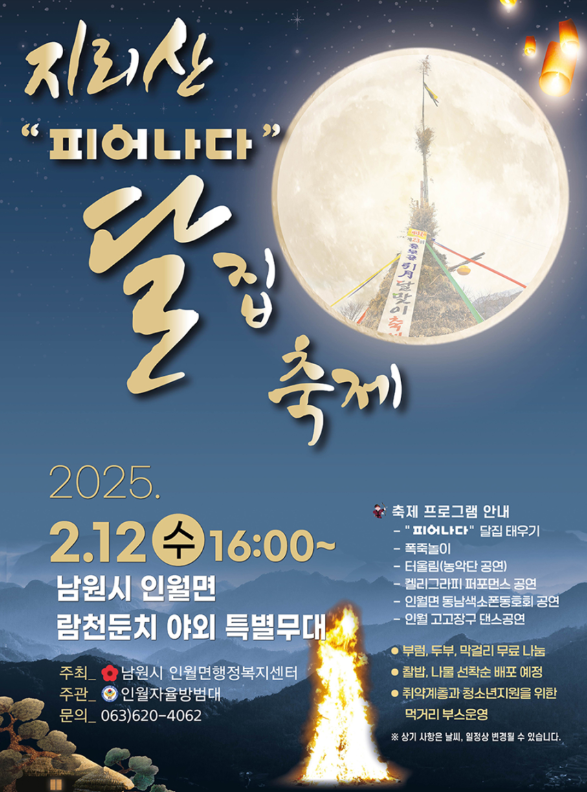 - 내용 : "피어나다" 달집 태우기, 폭죽놀이, 터울림(농악단 공연), 켈리그라피 퍼포먼스 공연, 인월면 동남색소폰동호회 공연, 인월 고고장구 댄스공연, 부럼, 두부, 막걸리 무료 나눔, 찰밥, 선착순 배포 예정, 취약계층과 청소년지원을 위한 먹거리 부스 운영