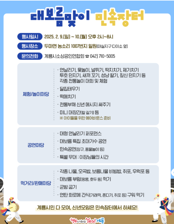 - 내용 : 윷놀이 대회(사전 온라인 접수, 미달 시 당일 현장접수 가능), 전통문화체험(놀이체험, 전통차, 전통먹거리, 기원행사 등), 푸드트럭 및 플리마켓, 시상 및 경품추첨