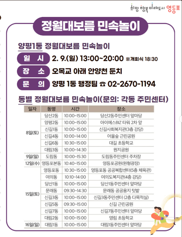 영등포구에서는 2월 8일(토)부터 2월 16일(일)까지 동마다 동별 정월대보름 민속놀이 행사가 진행됩니다.