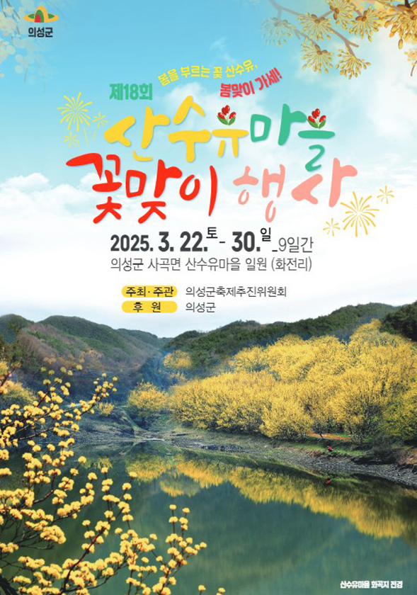 - 내용 : 수령 100년이 넘는 산수유나무가 군락을 이루며 피워내는 산수유꽃을 감상하며 봄을 만끽해 보세요.