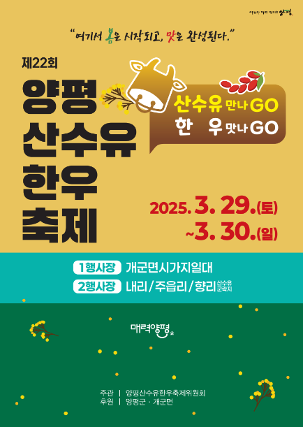 - 내용 : 양평 산수유마을에서 봄바람 맞으려 산수유 구경하고 한우도 저렴하게 맛볼 수 있습니다.