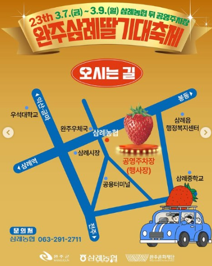 지역 농가에서 재배한 신선한 딸기를 주제로 3월 7일부터 9일까지 3일간 삼례농협 뒤 공영주차장 일원에서 '제23회 완주 삼례딸기 대축제'가 열립니다.