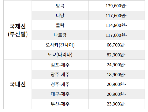 - 제주출발 : 김포, 광주, 청주, 대구, 부산