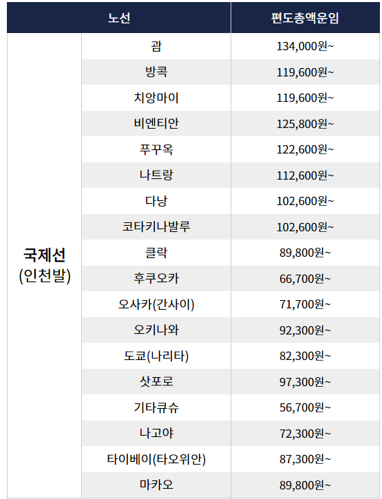 - 인천출발 : 후쿠오카, 오사카, 오키나와, 도쿄(나리타), 삿포로, 기타큐슈, 나고야, 타이베이, 마카오