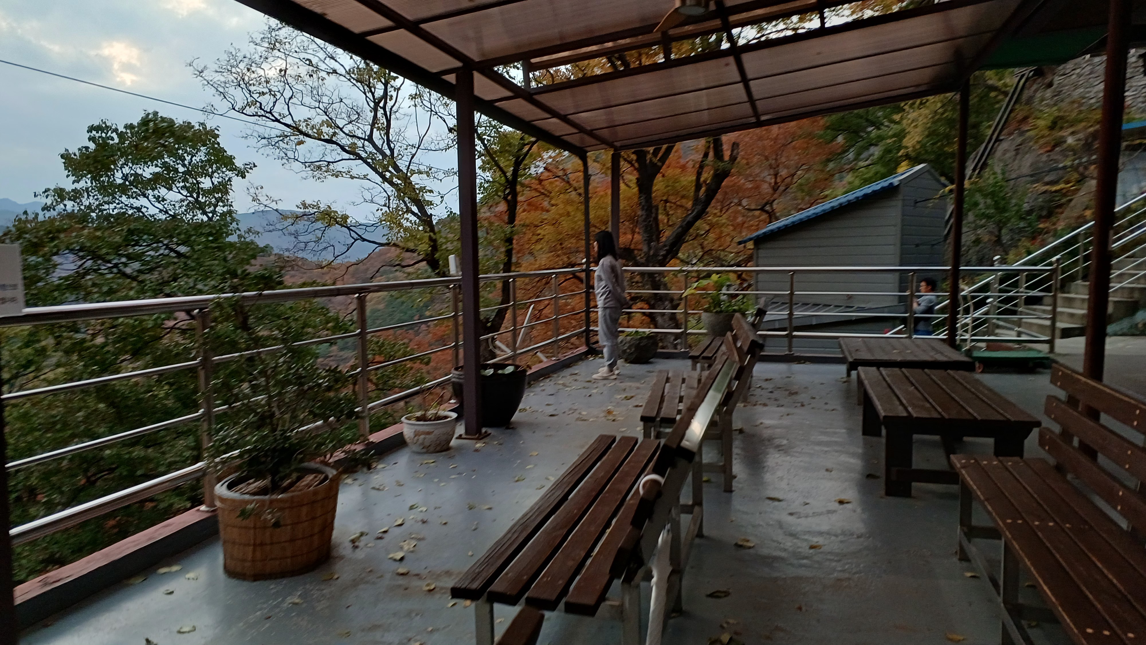 휴게소 끝 계단 쪽에는 공양을 할 수 있는 식당이 있었는데, 보살님께 여쭤보니 거의 24시간 운영된다고 합니다! 사찰 음식을 좋아하는 저는 공양을 하고 싶었지만, 이상하게 남편이 이번에는 당기지 않는다고 완강히 거부하더라고요. 결국 남편은 따뜻한 커피, 저는 달달한 코코아를 마시며 잠시 휴식을 취하며 멋진 경치를 감상했습니다.