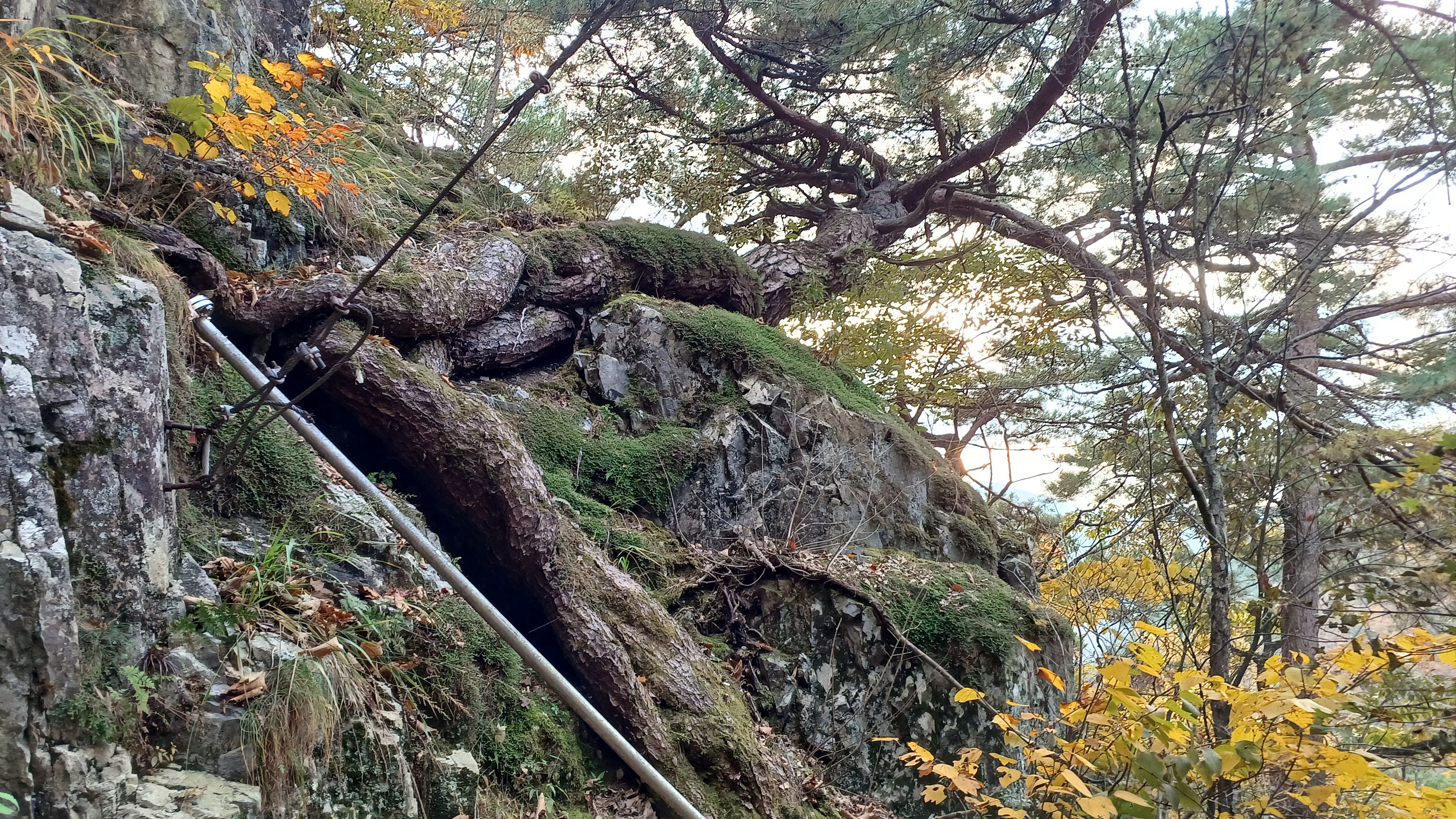 아슬하게 바위에 기대어 뿌리를 내린 듯 인상 깊은 소나무를 지나 가을 단풍이 예쁘게 물든 경치도 구경하며 오르다 보니, 드디어 사리암의 모습이 보이기 시작하네요. 등산로 입구에서 받았던 지팡이는 이곳에 두고 다시 마지막 힘을 짜내 사리암에 도착했어요.