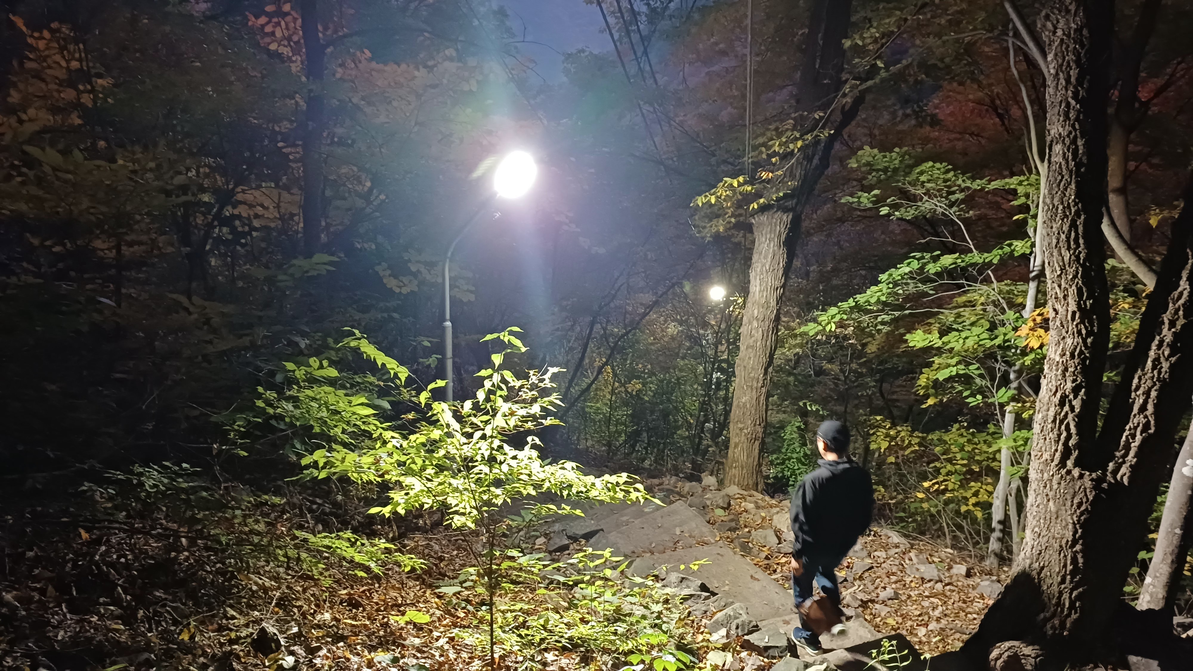 아쉬움을 뒤로하고 하산을 시작했습니다. 산속은 어둠이 빨리 찾아왔는데요. 가로등 불빛이 길을 밝혀줘 어렵지 않게 내려올 수 있었어요. 혼자였다면 무서웠겠지만, 옆에 남편이 있어 밤중 산행도 색다른 경험을 선사하며 즐거웠습니다.