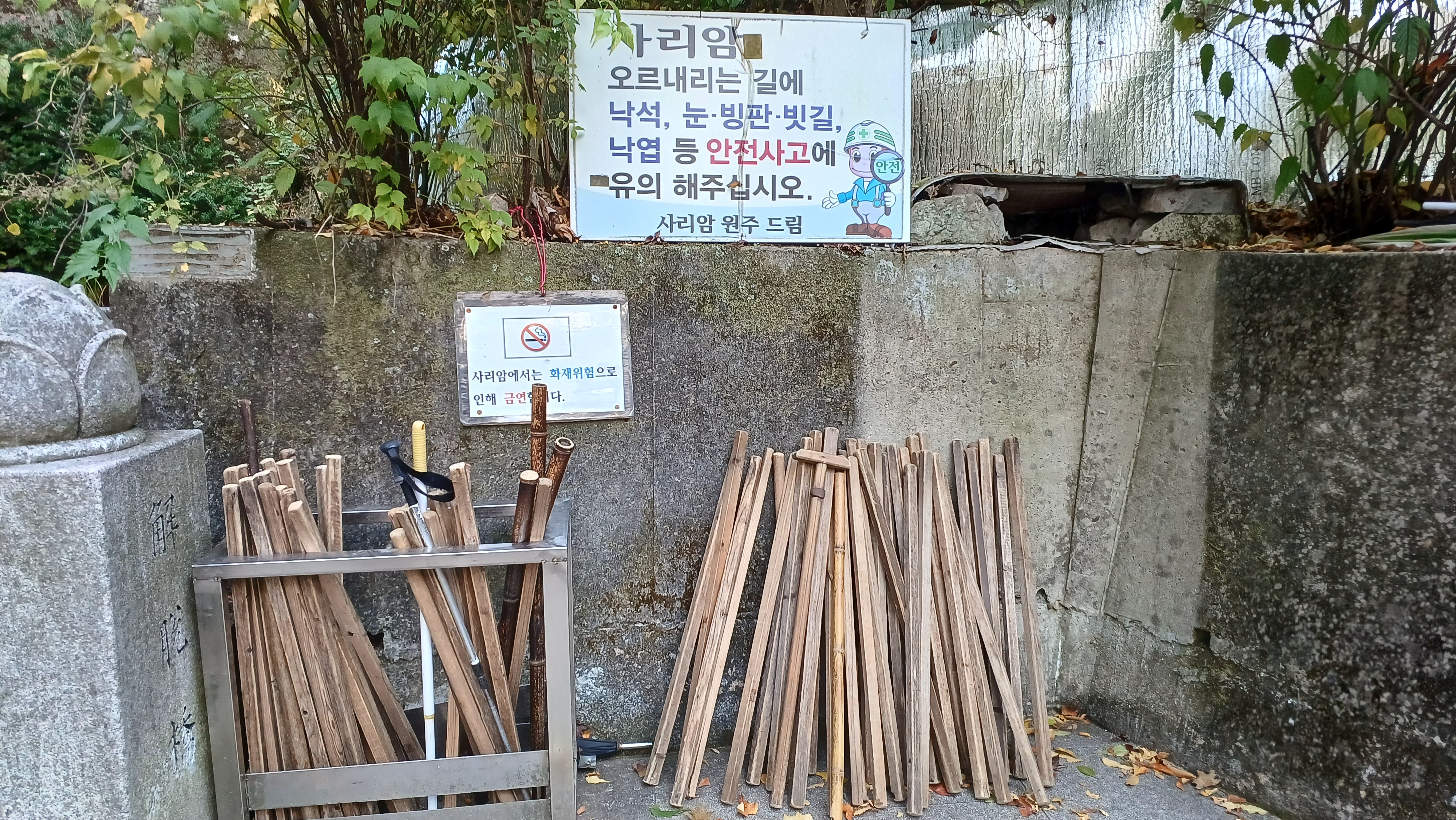 걷는 것이 힘들게 느껴진다면 등산 스틱이나 지팡이를 활용하는 것이 좋습니다. 다행히 등산로 입구, 계단 구간 입구, 그리고 암자 입구 이렇게 3곳에 준비되어 있으니 꼭 이용해 보세요. 큰 바위 쪽에 있는 등산로 입구에서부터 하나 챙기는 걸 추천합니다!