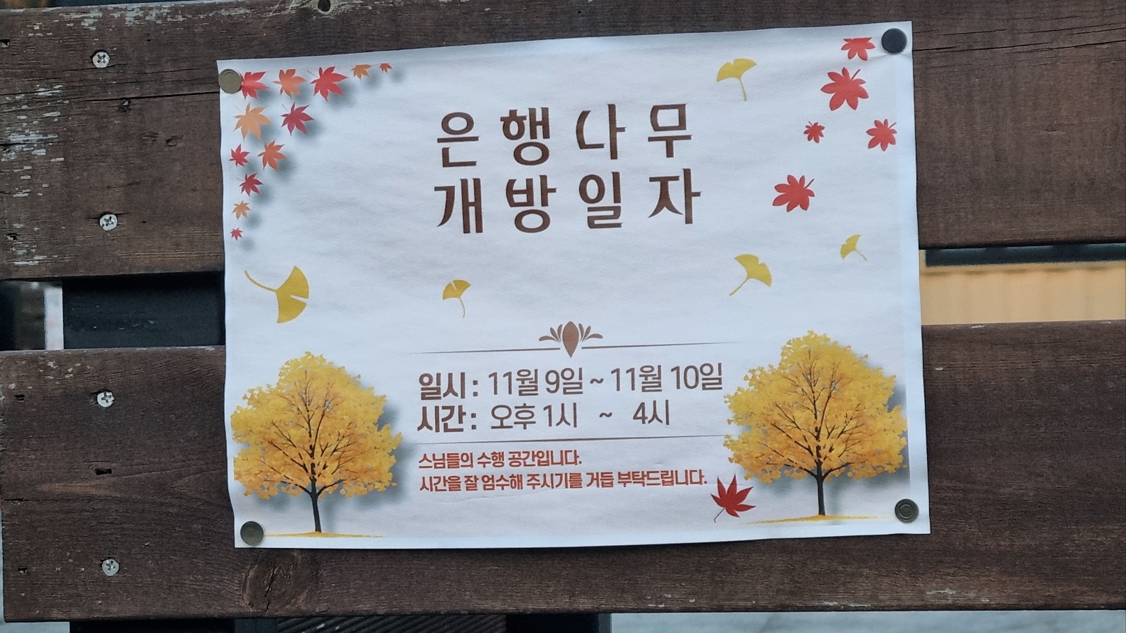 혹시나 불이문이 열려있으면 그 사이로나마 은행나무를 보고 싶은 마음에 주차 후 발걸음 하였더니 5시까지 개방한다는 반가운 소식이 들려왔습니다. 아마도 차량이 많이 정체된다는 소식을 접하고 자비를 베푸시는 것이 아니었을까 합니다.