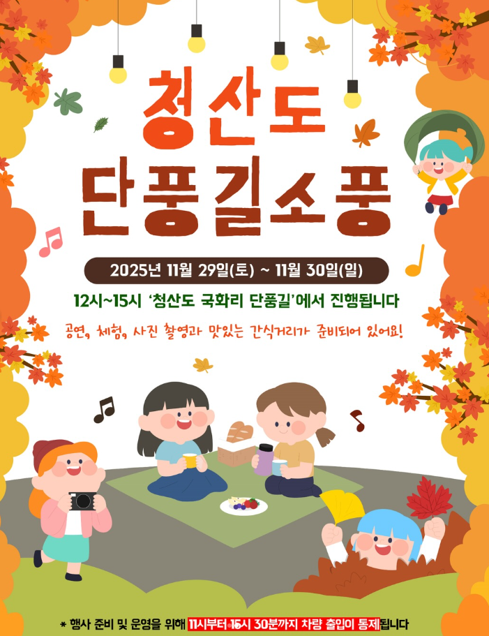 완도군 청산도에서는 단풍이 절정에 달하는 시기에 맞추어 지역 주민들이 주도하는 특별한 가을 행사인 '단풍길 소풍' 행사가 11월 29일부터 30일까지 이틀간 청산도 국화리 단풍길 일대에서 개최됩니다.