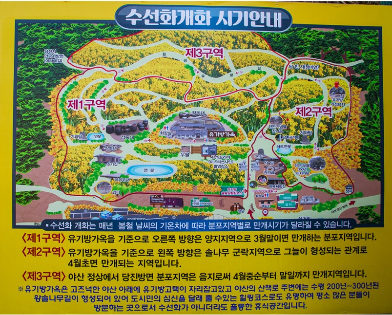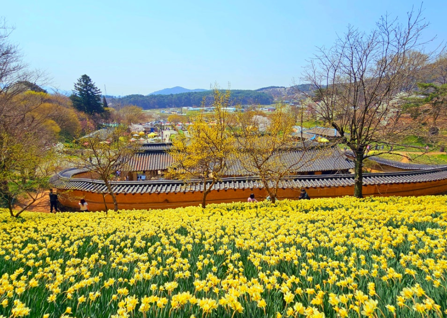 3월 충남 민속문화재 제23호인 100년 고택 서산 유기방가옥 주변으로 노란 수선화가 가득 피어납니다. 서해안의 전통 한옥과 언덕 위를 노랗게 물들이는 수선화 풍경을 느끼며 봄해살 아래 거닐기 좋습니다.