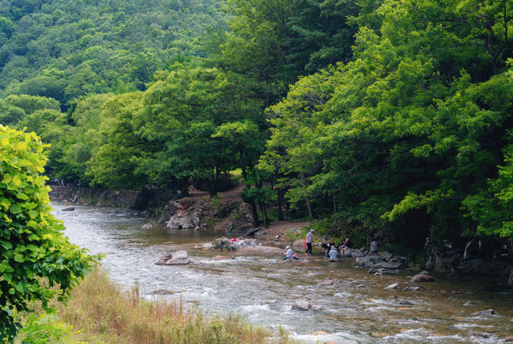 하천 폭이 넓고 수심이 얕은 곳과 깊은 곳이 적절히 섞여 있어 아이들부터 어른까지 모두 즐겁게 물놀이를 할 수 있습니다. 505번 지방도로와 나란히 흐르고 있어 접근성도 좋습니다.