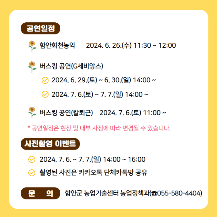 올해 강주해바라기축제 개최일을 당초 6월 26일로 예정했으나 해바라기가 일찍 꽃을 피워 6월 22일로 변경되었습니다. 또한 축제기간도 7월 14일까지로 되어 있으나 개화상황에 따라 일찍 종료될 수 있다고 함안군에서 공개했습니다.