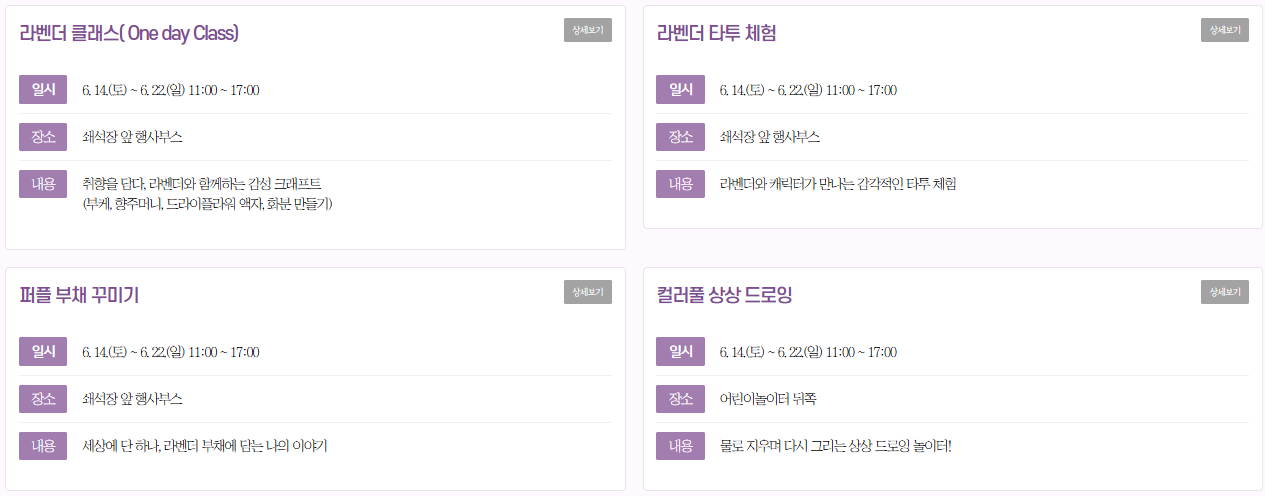 - 체험 : 컬러풀 상상드로링, 라벤더 클래서, 타투 등